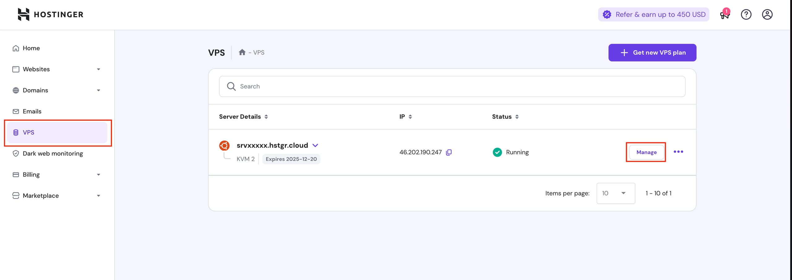 Navigate to the VPS section of your hPanel and click on Manage next to your chosen server. Next, open the Settings page.