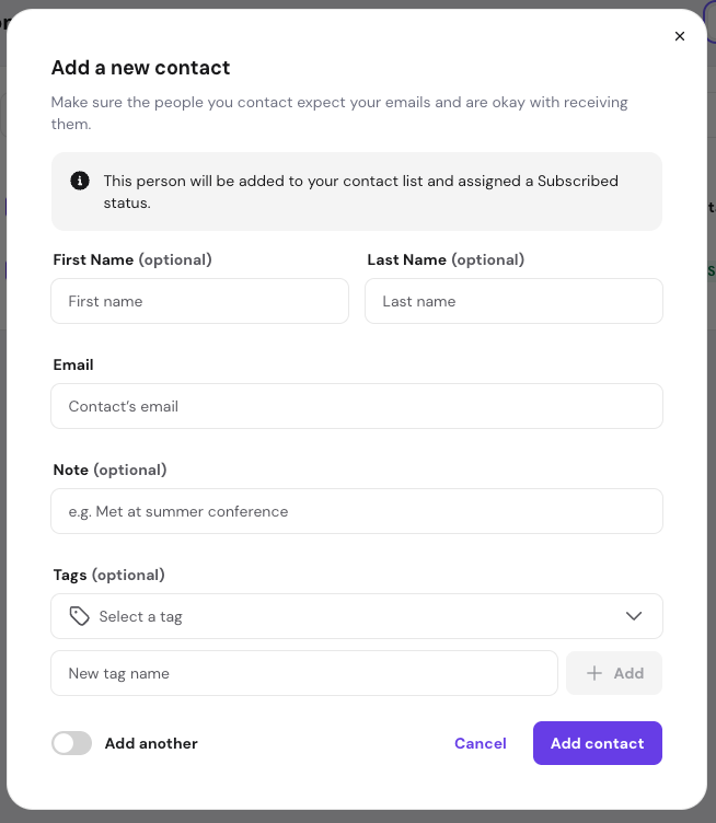 If you have more than one contact to add, toggle the Add another option to keep the form open.