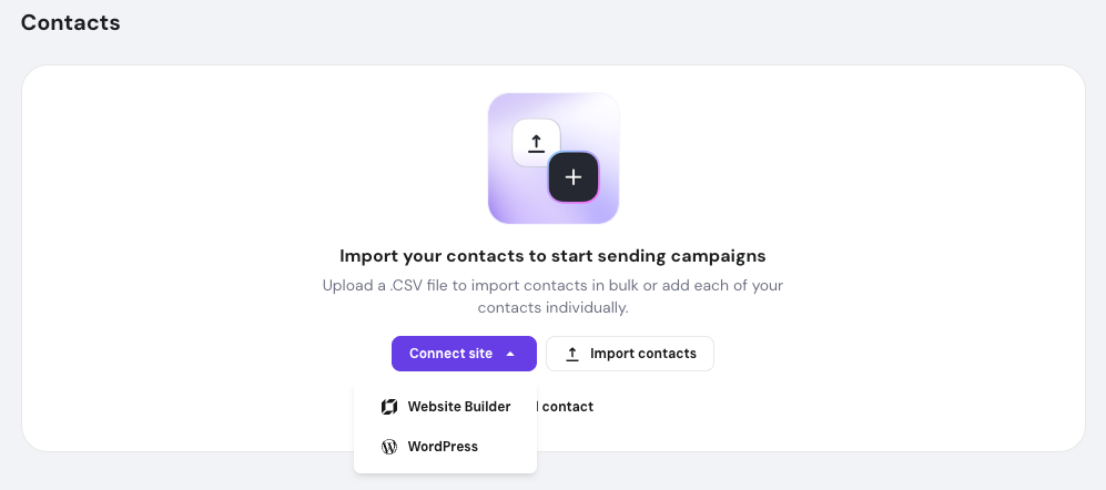 - If no contacts have been added yet, the option will appear below Connect site and Import contacts.