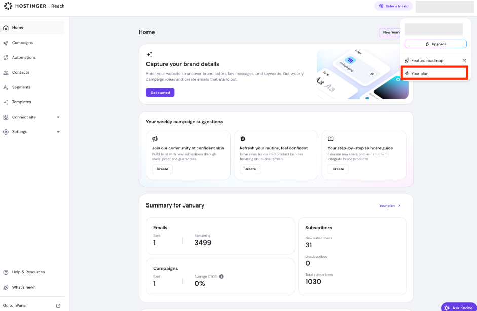 Explore the offering in detail at the landing page. If you already have a plan, Upgrade it anytime in your hPanel account or Reach dashboard.