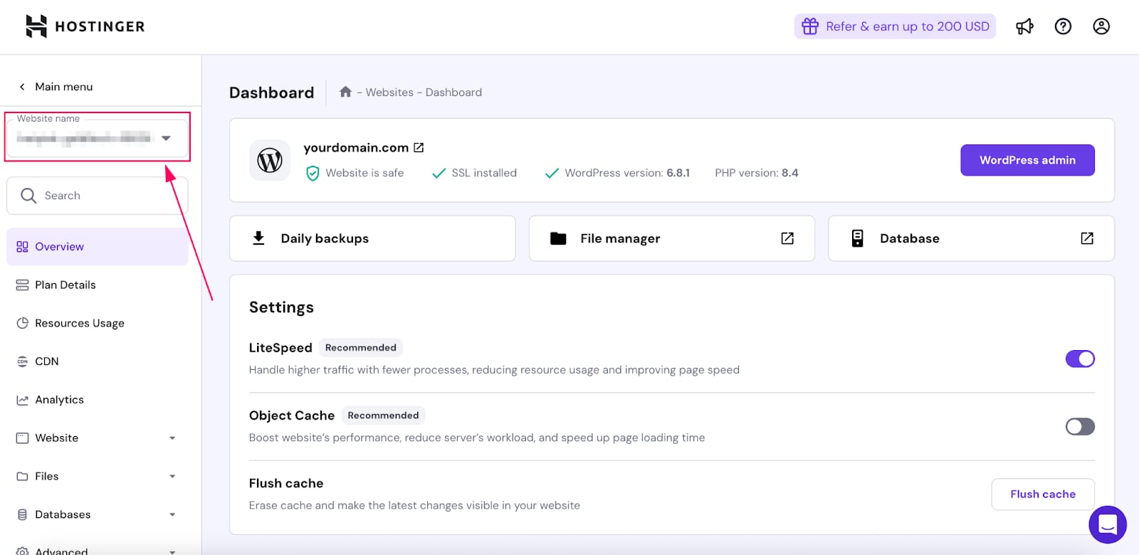 Step 1 – Select the website in your hPanel select the website for which files you want to download on the left side menu:
