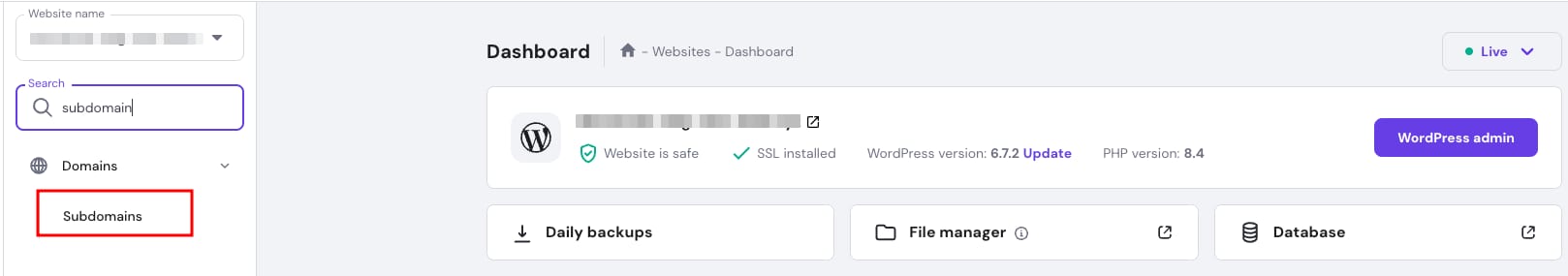 Once the steps are completed, you will see your new subdomain’s dashboard where you can manage its settings.