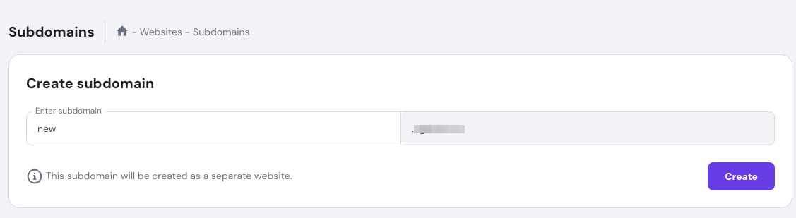 Step 3 – Under Create subdomain, enter a name for your new subdomain, then click Create.