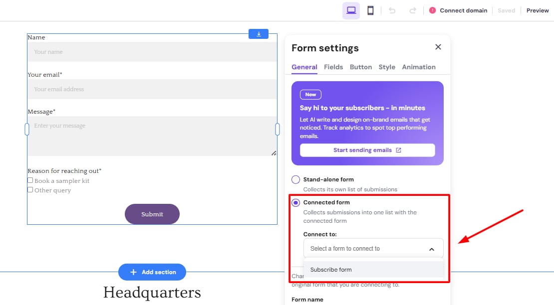Within the two solutions, you will be able to smoothly use your contact form submissions from the website on Hostinger Website Builder inside your email marketing campaigns on Hostinger Reach.