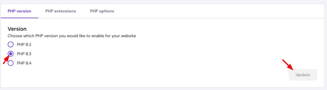 - You can only select PHP versions 8.2 and higher