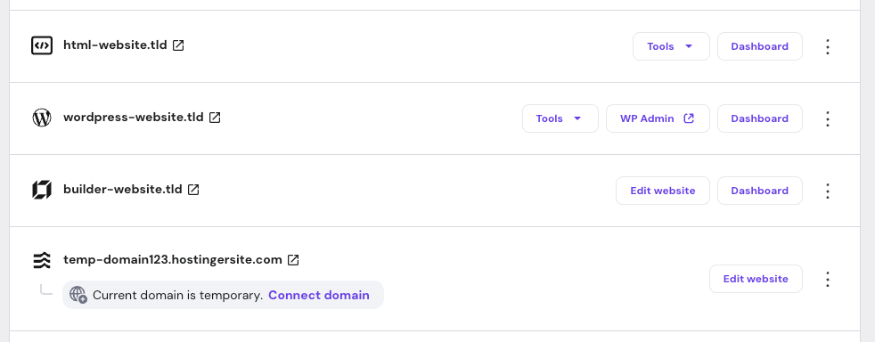 You can also continue with a temporary domain and connect a custom domain later. By default, new Hostinger Horizons and Website Builder websites are created on a temporary domain, without prompting for a custom domain during setup.