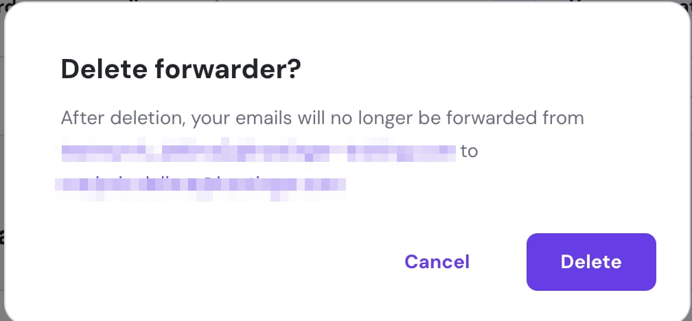 To remove the forwarder, click on Delete. After deletion, your emails will stop being forwarded. If needed, you can re-create a deleted forwarder at any time.
