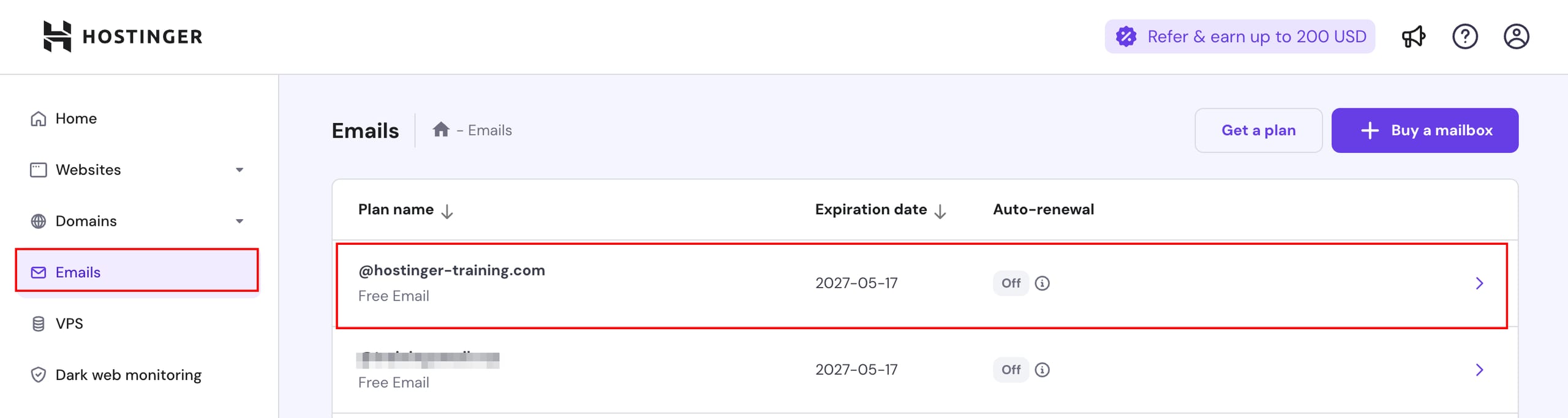 Navigate to the Emails section of hPanel and click on anywhere next to the domain or subdomain of the plan you want to manage.