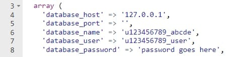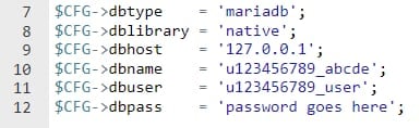 Open the config.php file inside the public_html folder of your domain. Here, you need to specify the values corresponding to your database as follows: