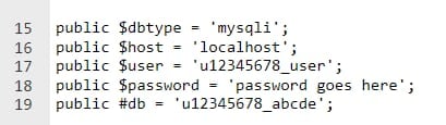 Open the configuration.php file inside the public_html folder of your domain. Here, you need to specify the values corresponding to your database as follows: