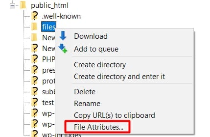 If you have already connected to your website files using an FTP client such as FileZilla, all you need to do to set permissions is right-click on the file or folder you want to set permissions for and choose File Attributes (or File Permissions, the name can be different based on your FTP Client’s version):