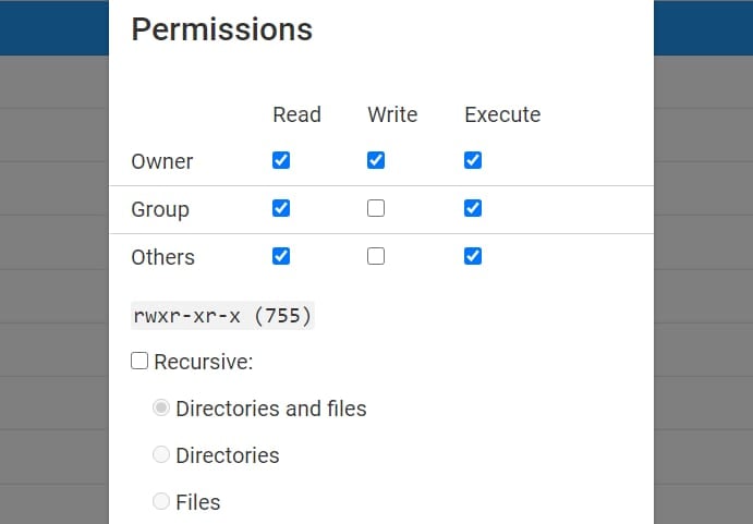 In the opened window, choose the needed permissions with checkboxes or set them with a number. You can also make them recursive.