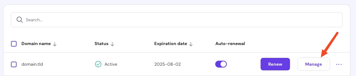 To manage the DNS records of a domain registered at Hostinger, navigate to the Domains section → Domain portfolio. Then, click Manage next to the domain in question: