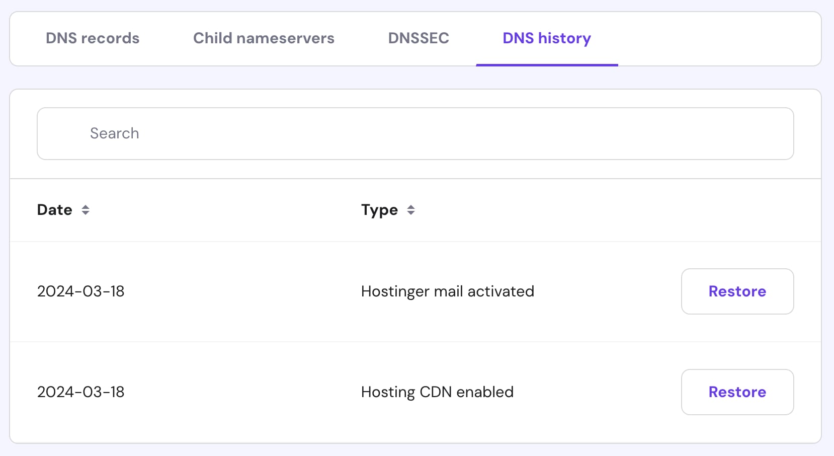 To restore your DNS zone to a previous version, select the DNS history tab and click on Restore next to the date for which you want to roll back any DNS changes:
