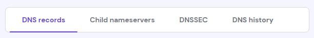 At the top of the DNS / Nameservers section, there are four main tabs: DNS records, Child nameservers, DNSSEC and DNS history: