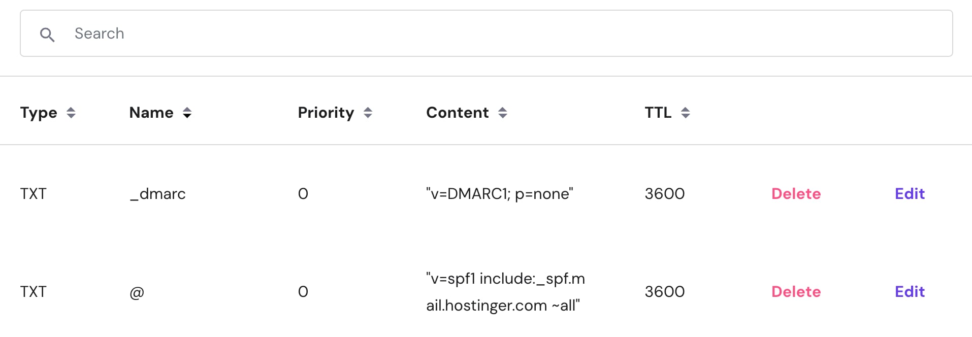You can view the full list of DNS records for your domain below the Manage DNS Records section. Use the search bar to find a specific record.