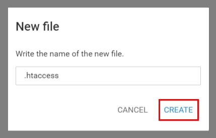Enter the name .htaccess (make sure the dot is added at the beginning) and click on Create: