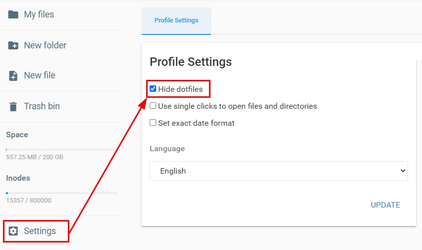 Next, click on Update to save the changes. Now you will be able to see all hidden files, including .htaccess 😊