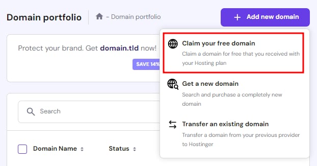 If you already own a domain, the option to claim a free domain will also be available on the Domain Portfolio page – click on Add New Domain, and select Claim your free domain: