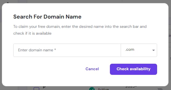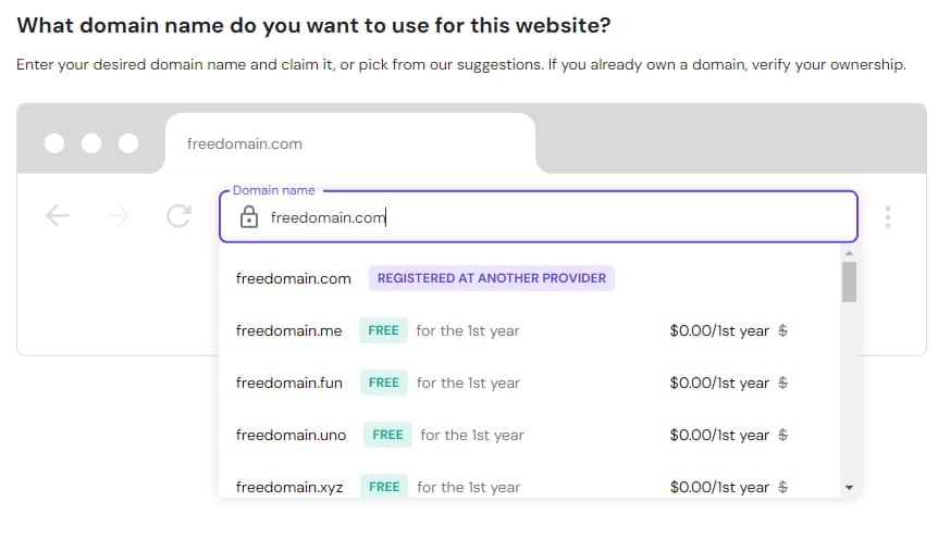 During hosting plan setup – When prompted to enter your desired domain name, eligible free domain options will appear in a drop-down list. Select your preferred option and continue with the setup: