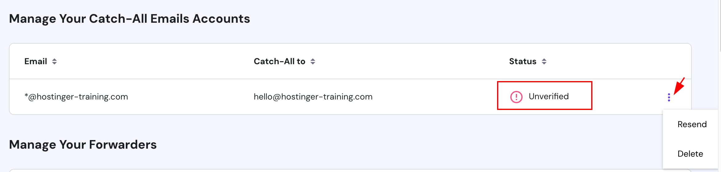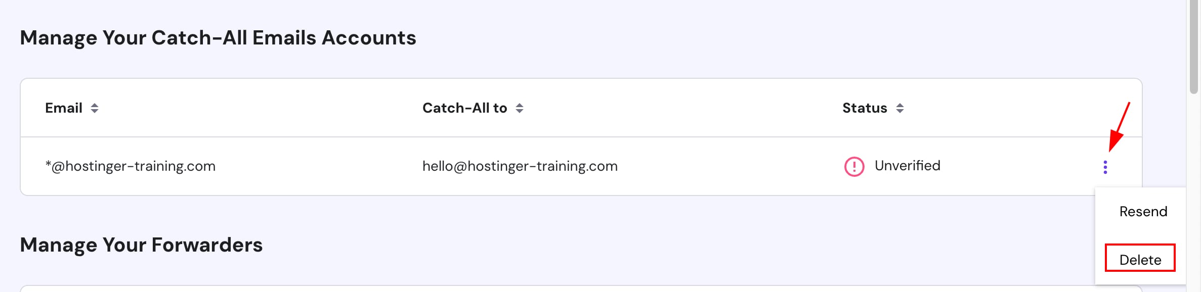 In the Forwarders section, navigate to Manage Your Catch-All Emails Accounts, click on the options button ( ⋮ ) next to the catch-all, and click on Delete: