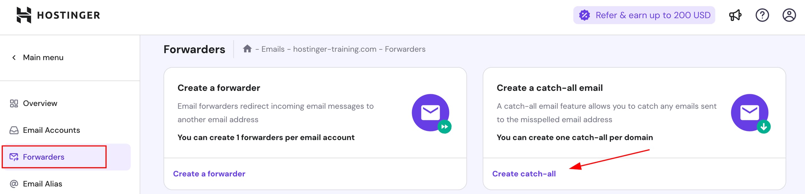 Next, select Forwarders on the left sidebar and click on Create catch-all:
