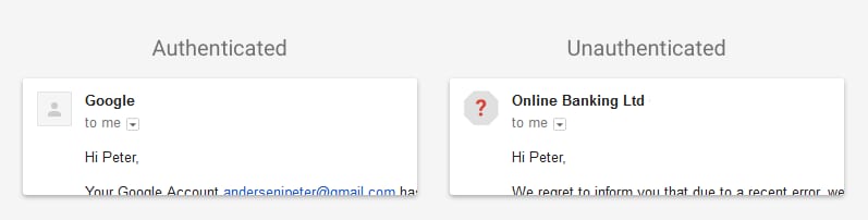 If Google can’t confirm that an email is coming from the person who appears to be sending it, it treats them as non-authenticated email senders and shows a red question mark as their profile picture: