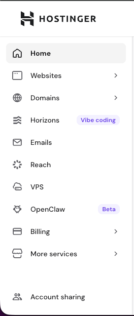 Home: This area centralizes your active Hostinger services. It includes the following features: