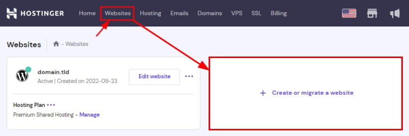 To host multiple websites, go to the Websites section of your panel and click on Create or migrate a website: