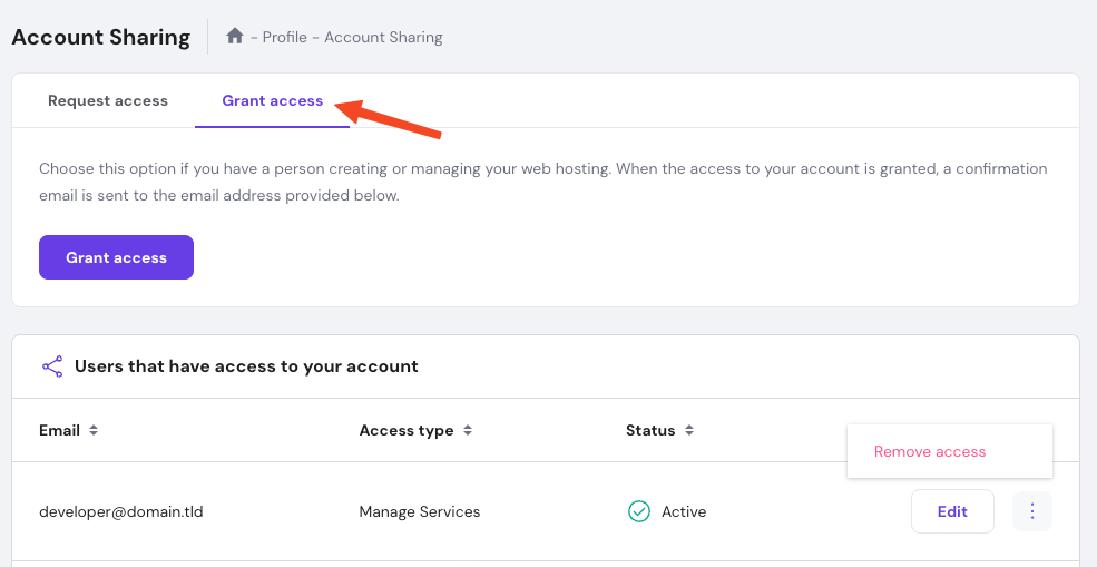 For the current users with granted access, check the Users that have access to your account list on the Grant access tab, where the email addresses, access type, and status will be listed.