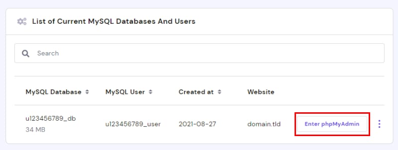 To access your database contents via phpMyAdmin, click on Enter phpMyAdmin: