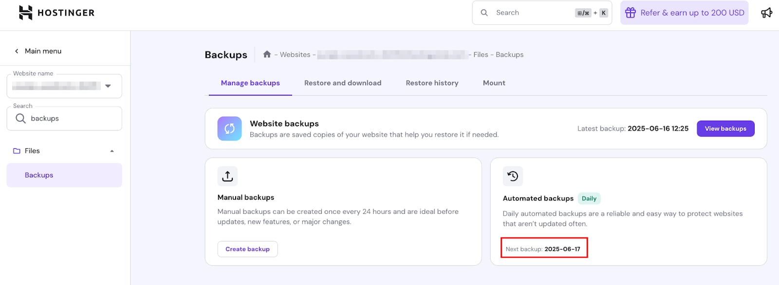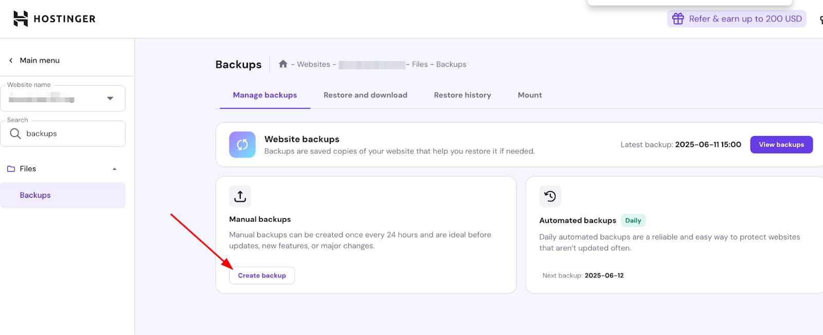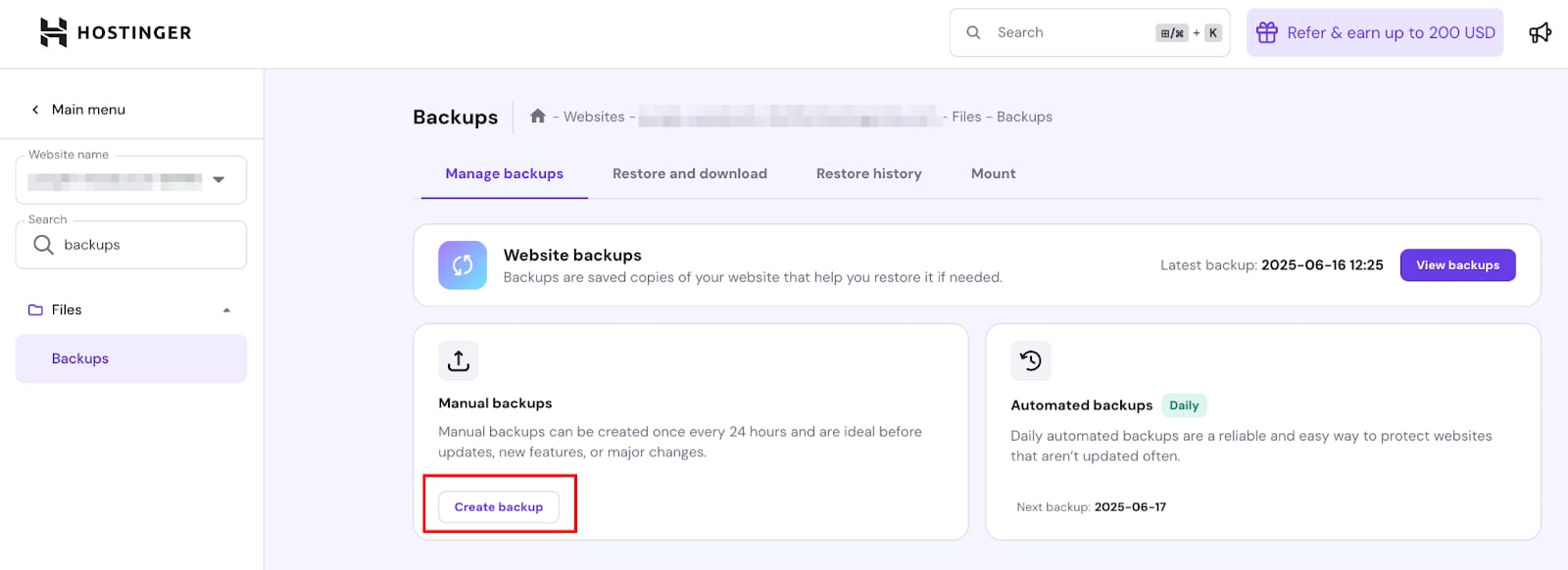 At Hostinger, if your hosting plan is Business or greater, you can use the Backup tool to manually create backups of all the files and databases on your hosting plan. Just go to Websites → Dashboard, search for Backups on the sidebar, and click on it: