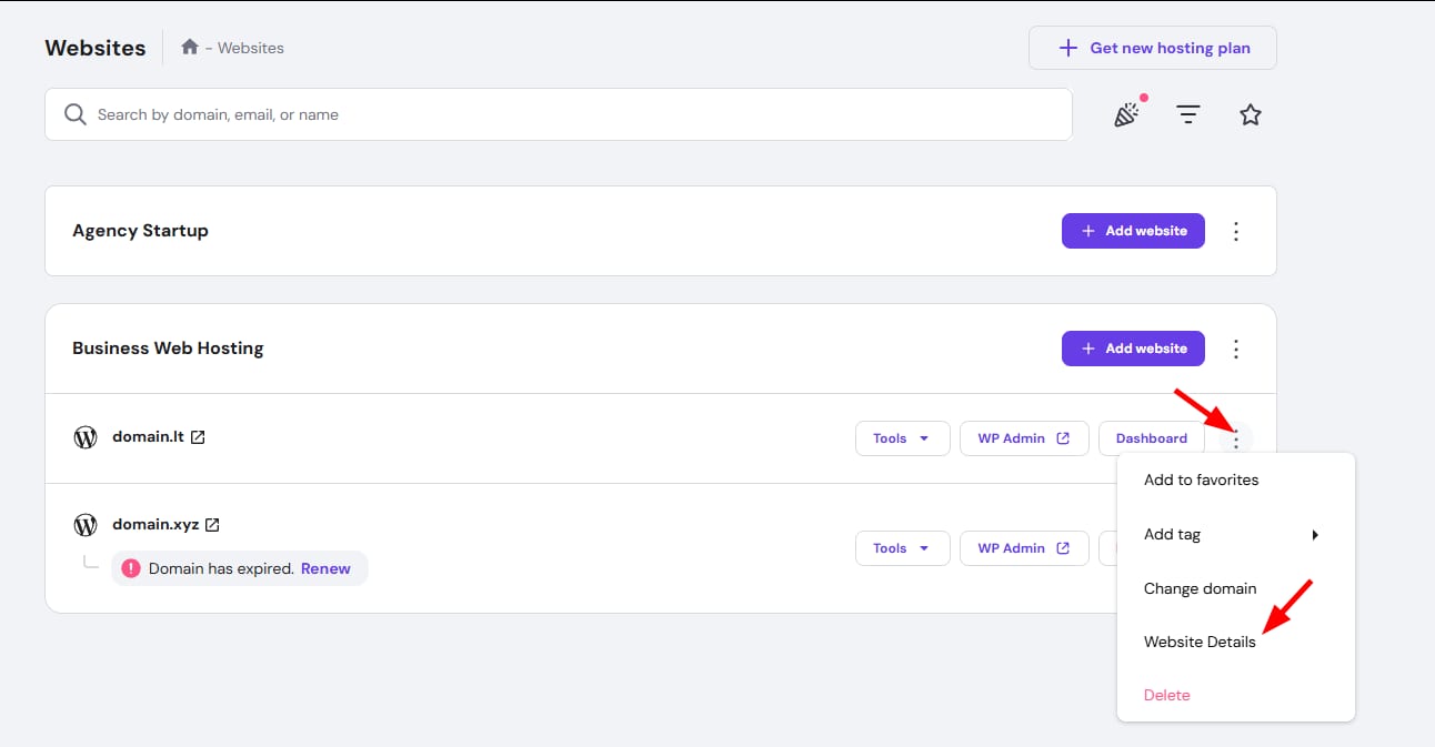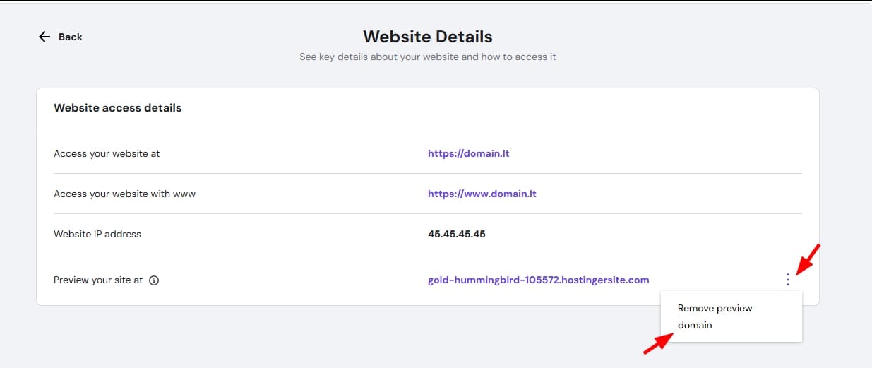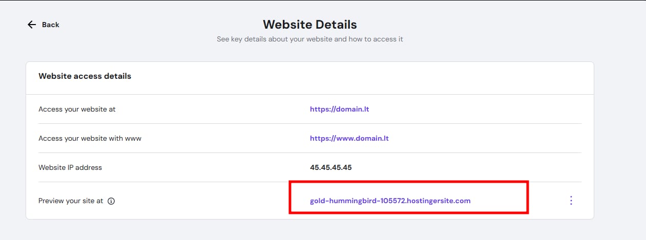 You can use preview domain if your domain is not pointing to Hostinger’s nameservers yet. To check your preview domain, you can go to Websites, click the ellipsis besides the domain you want to see the preview, then click Website Details: