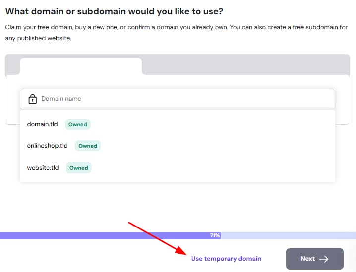 During the process of adding a website to your hosting plan, you will have the option to use a custom domain or subdomain you already own, or use a randomly generated temporary domain.