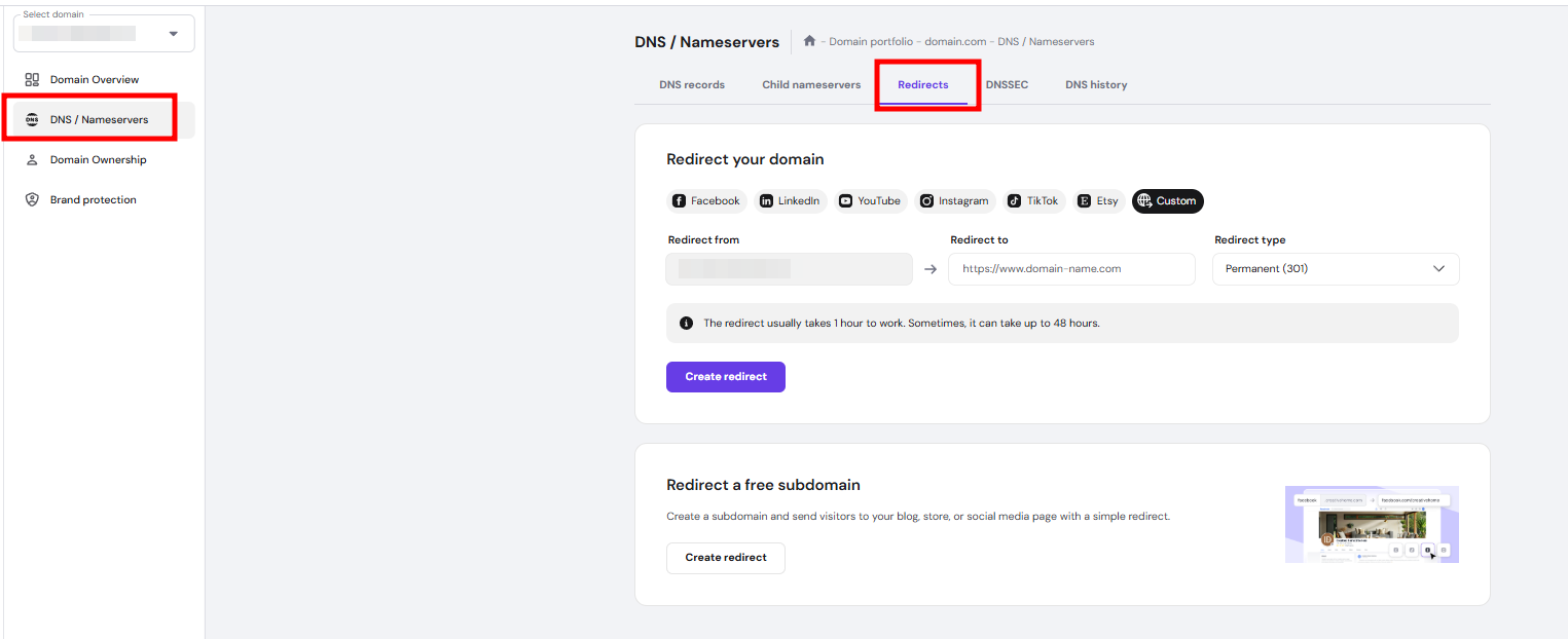 1. Log in to hPanel, navigate to Domains on the sidebar, and click Manage next to the domain you want to redirect. Then, go to DNS / Nameservers and open the Redirects tab: