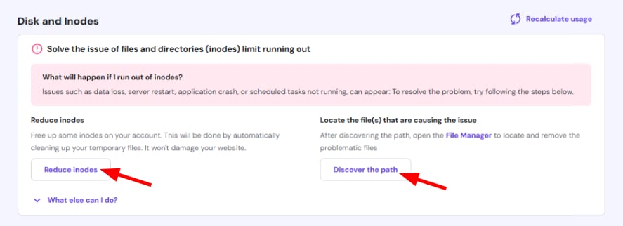 If your inode or disk usage exceeds the limit, Hostinger’s hPanel provides an option to automatically reduce inode usage and identify the directories consuming the most space.