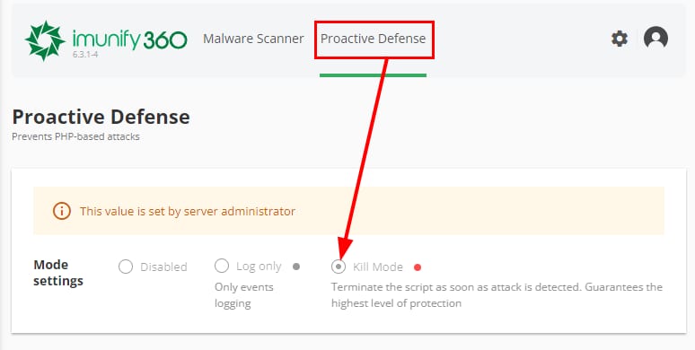Click the Proactive Defense menu on your Imunify360 dashboard, you’ll see the Kill Mode enabled:
