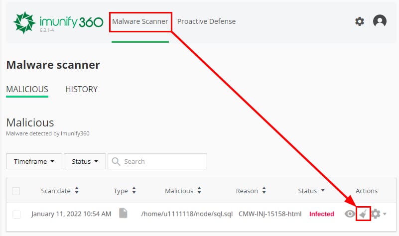 In case a suspicious file is detected but it was not automatically deleted, go to the Malware Scanner tab and delete the malicious file by clicking on the broom icon under Actions section: