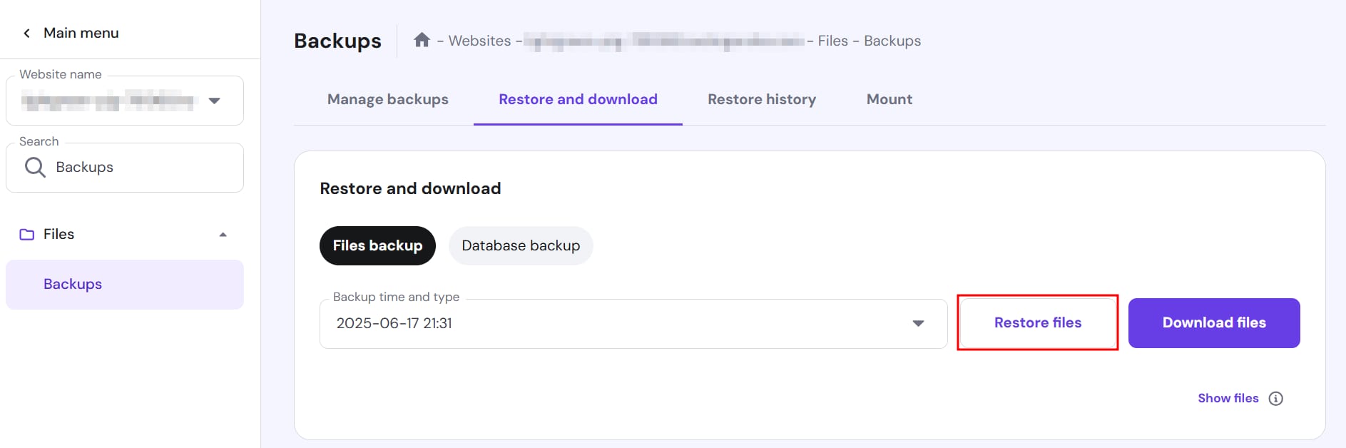 Once on the Backups sections of your panel, select Restore and Download tab. Under Files backup, select your preferred date and click Restore Files: