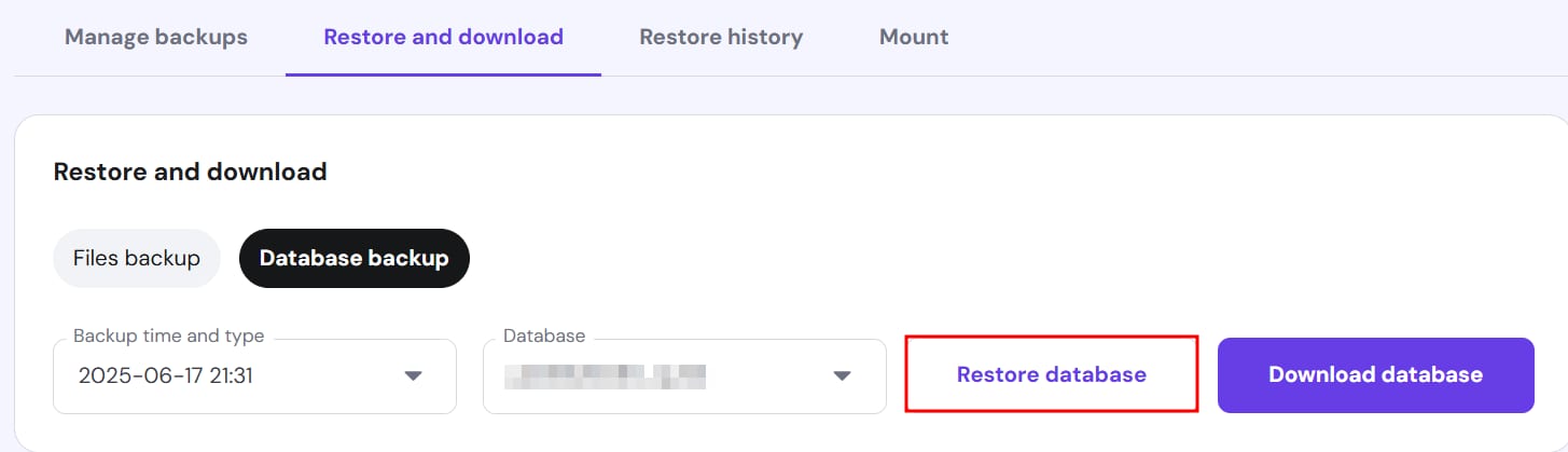 Once the files restoration is complete, repeat the same steps under Database backup. You’ll be shown a dropdown to enter your database name. If you’re unsure about your database name, check out our guide How to Find Your WordPress Database.