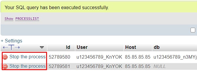 Once that’s done, the list of current processes will be generated. You can stop each one by clicking on Stop the process: