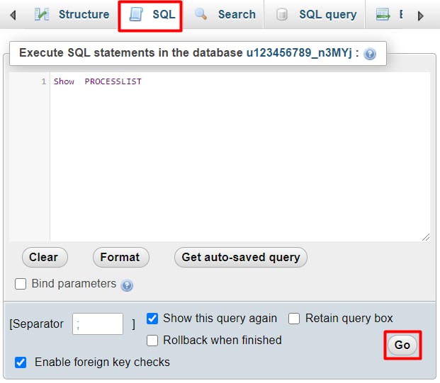 Click SQL on the top menu, type SHOW PROCESSLIST and click GO: