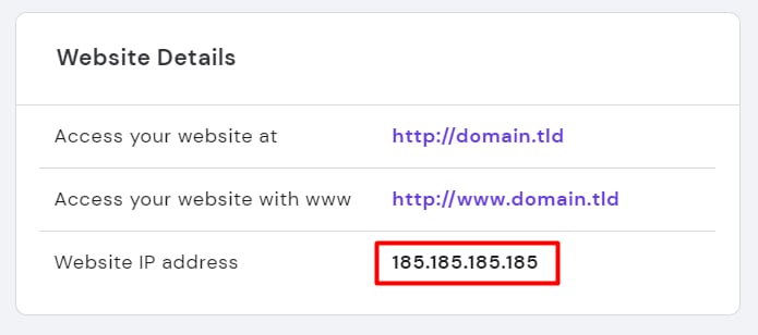 To find out the IP address of your hosting plan, go to Websites → Dashboard, search for Plan Details in the sidebar and click on it: