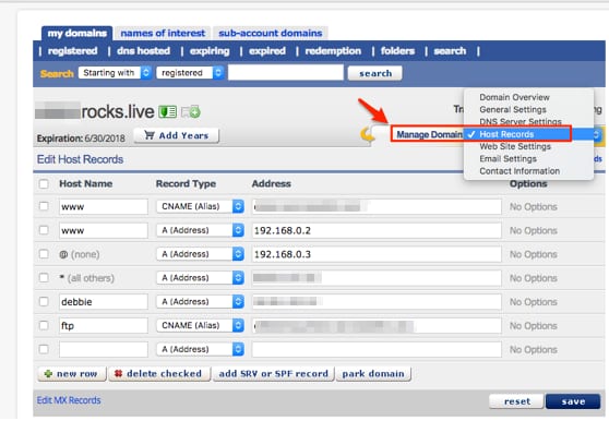 If your domain is registered with eNom, you can access your DNS Zone by clicking on Manage Domain → Host Records: