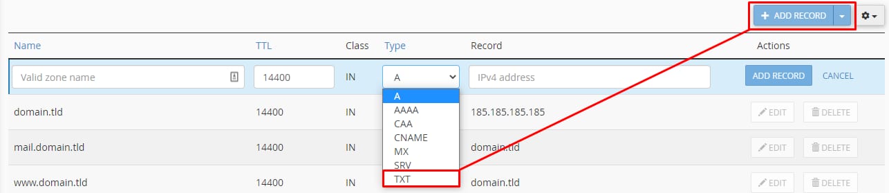 Next, click on the Add record option and select the TXT record type: