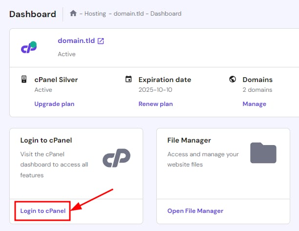 To log in to your cPanel and manage your hosting plan, you have two available methods: