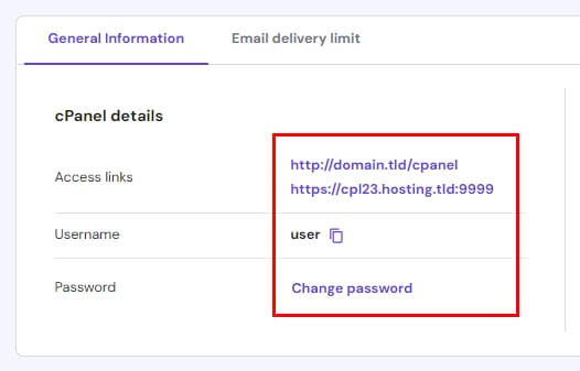 Two alternative URLs to access the login page: via your domain name by adding /cpanel or using the Hostinger server and port