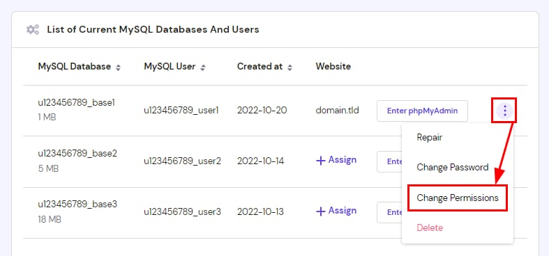 In the section List of Current MySQL Databases And Users, click on ⋮ button in front of the desired database and choose Change Permissions: