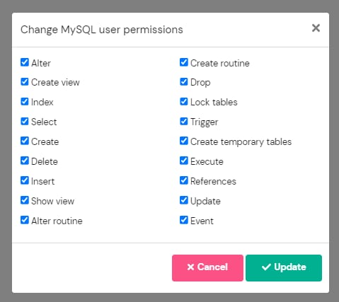 By default, MySQL user has all the permissions granted. You can revoke permissions by removing the checkmark next to the specific permission: