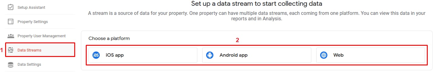 2. Google will require basic information about your website or your business. Once you have finished the sign-up process, you will be redirected to your account. Click on Data Streams and choose your desired data stream, for this article we will use Web: